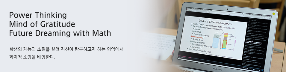 러시아 수학자 소피아는 수학자이면서 동시에 시인이 아닌 것은 불가능하다고 합니다. 대부분의사람들은 수학적 상상력과 인문학적 상상력이 서로 다른 것이라고 생각합니다. 그러나 수학과 인문학 양쪽을 모두 공부해본 사람이라면 수학자 소피아처럼 이 둘의 상상력이 결코 다르지 않다는 것을 알 수 있습니다. 이 둘의 조화를 통해 지력과 감성을 겸비한 전인적인 품성을 가진 학생을 양성합니다.